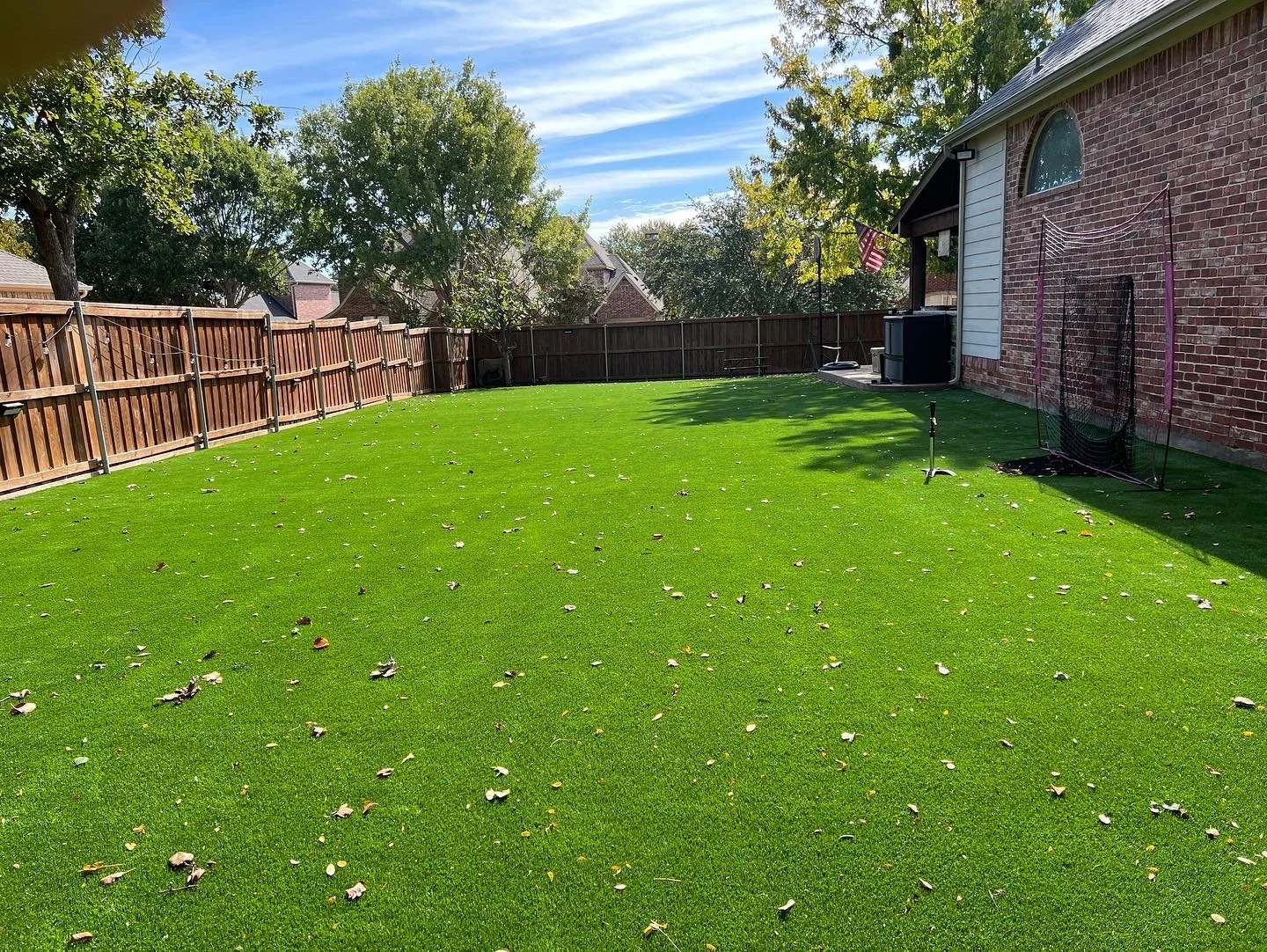 A backyard with bright green artificial turf, surrounded by a wooden fence, with a brick house on the right. There are some leaves scattered on the turf, and trees in the background providing shade.